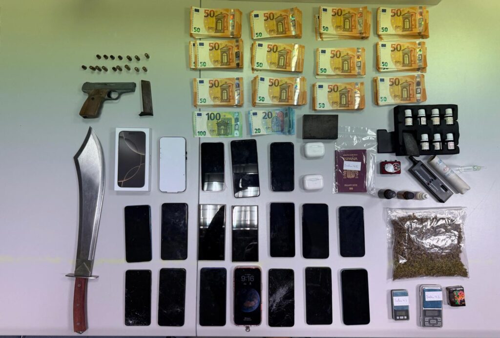 Durant l’escorcoll els agents van intervenir els 19 mòbils sostrets, 65 grams de marihuana, 47 grams d’haixix i més de 23.000 euros en metàl·lic. A més, es van trobar objectes relacionats amb el mercat de luxe il·lícit, com un detector de diamants i reactius d’or, així com un matxet i una pistola.